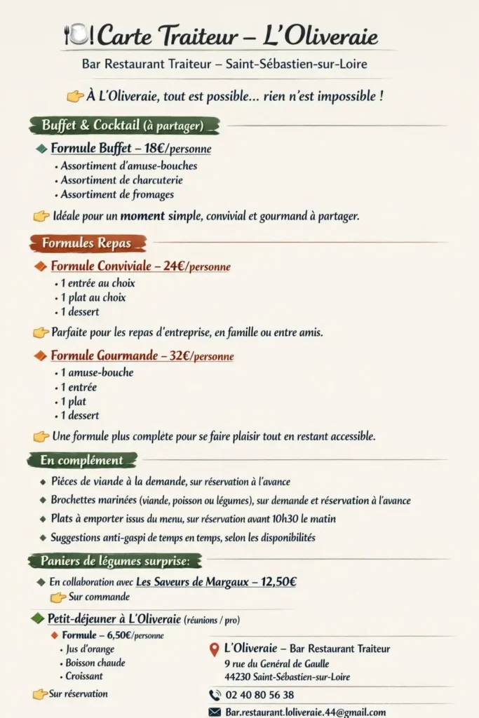 Enora RiotTrustindex vérifie que la source originale de l'avis est Google. Très bonne adresse dans le centre de Saint-Sébastien, l’équipe met beaucoup de cœur à l’ouvrage et ça se ressent dans l’assiette ! Anne-Gaëlle C.Trustindex vérifie que la source originale de l'avis est Google. Belle générosité dans l'accueil et les assiettes. Nous nous sommes regalés, les produits sont de bonne qualité, nous reviendrons ! Pierre SaupinTrustindex vérifie que la source originale de l'avis est Google. L’équipe de l’Oliveraie a réalisé le plat principal de mon anniversaire pour une trentaine de personnes, tout le monde s’est régalé ! Dennahic est très disponible et arrangeant. Je recommande si vous avez des événements. Jojo RoigTrustindex vérifie que la source originale de l'avis est Google. Très jolie lieu Un personne au petit soin Un cuisine pleine de saveur Une attention à allergie ou intolérance de chacun Un grand merci à vous tous Je recommande Lucie Fray GrijolTrustindex vérifie que la source originale de l'avis est Google. Repas de St Valentin : magnifique soirée. Table décorée avec goût. Le repas était parfait. Nous avons pu faire des modifications au besoin. Service rapide. Nous reviendrons. Orianne JacobTrustindex vérifie que la source originale de l'avis est Google. L'oliveraie est ouvert toute la matinée, nous pouvons y boire un café ou autre tout en travaillant, pratique pour les indépendants. La carte change tous les jours et tout est fait maison. Petite précision : leur poisson est parfaitement cuit. Je recommande cet établissement qui organise en plus divers événements. A découvrir . Jerome LEFEVRETrustindex vérifie que la source originale de l'avis est Google. Très bon restaurant. Qualité, personnels et ambiance sympathiques. Je recommande.... Thomas FTrustindex vérifie que la source originale de l'avis est Google. Très bon moment. Accueil génial, arrangeant et bonne humeur ! Cuisine avec de bon produits, maison, je recommande. Stephane ChanvinTrustindex vérifie que la source originale de l'avis est Google. Accueil, service et cuisine au top👍 Cla EstTrustindex vérifie que la source originale de l'avis est Google. C’est toujours un bon moment dans ce restaurant où on se régale…! L’accueil et le service sont irréprochables,, professionnels et d’une amabilité rare !