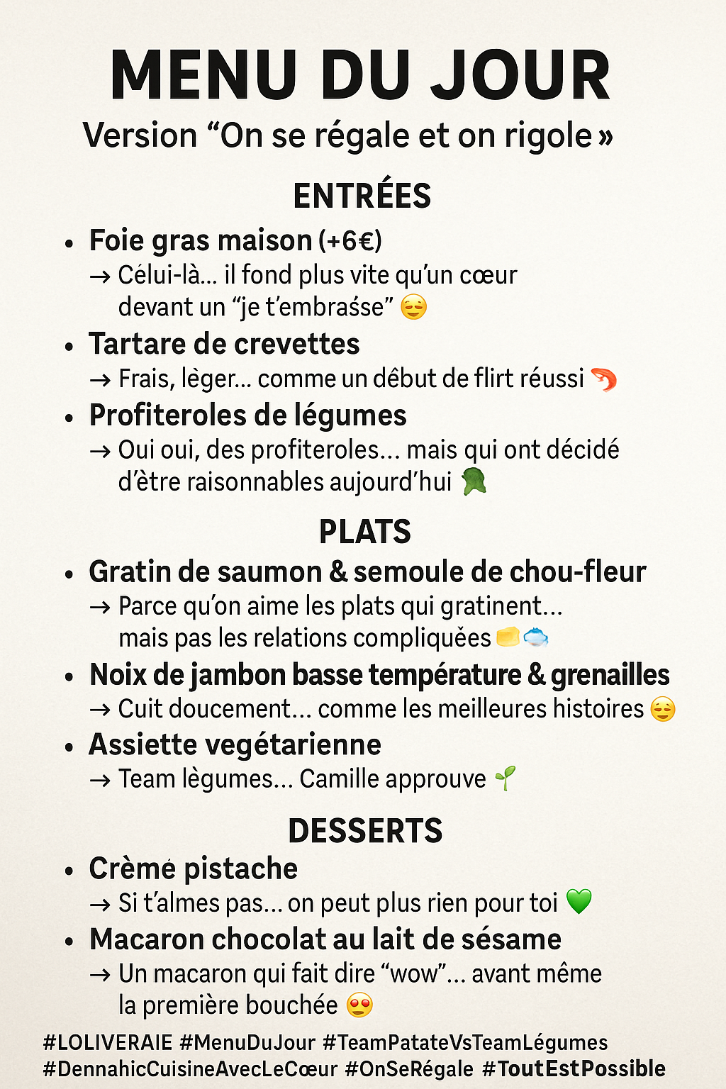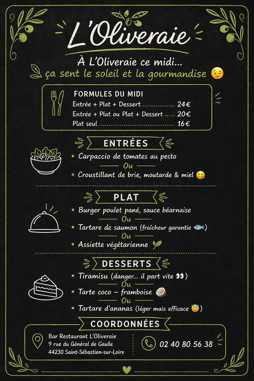 Bienvenue à l’Oliveraie, où tout est fait maison avec passion ! Découvrez des plats gourmands, préparés avec des ingrédients frais et de qualité, dans une ambiance chaleureuse et authentique.